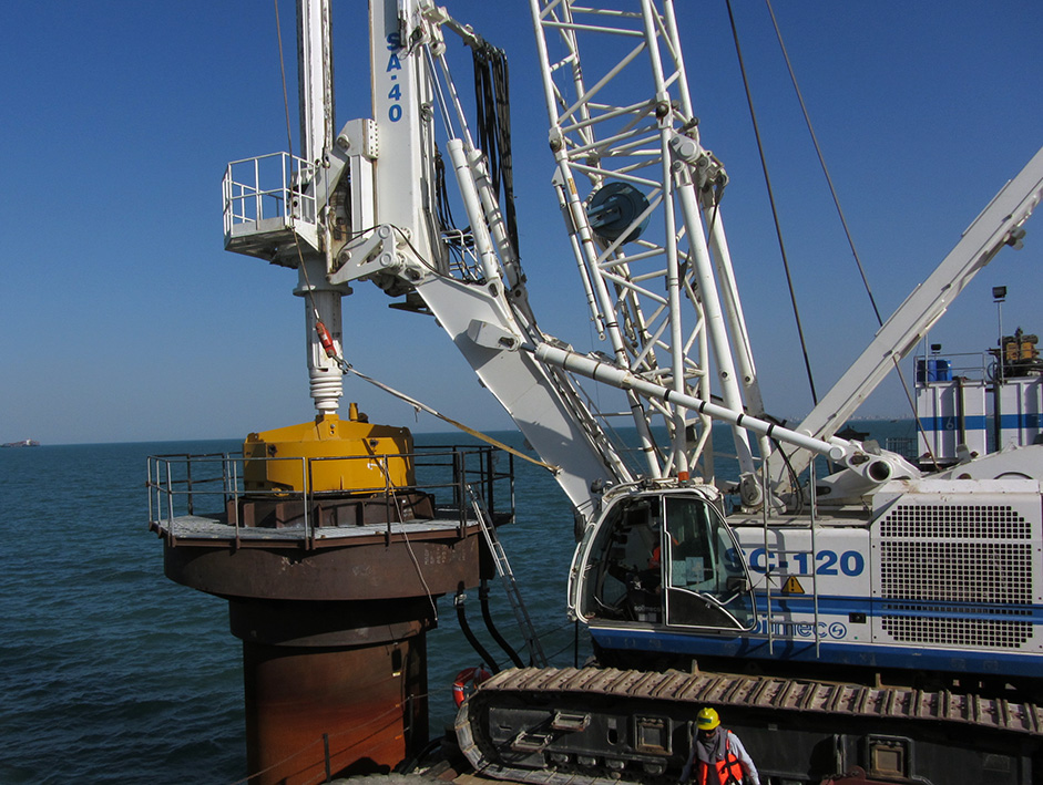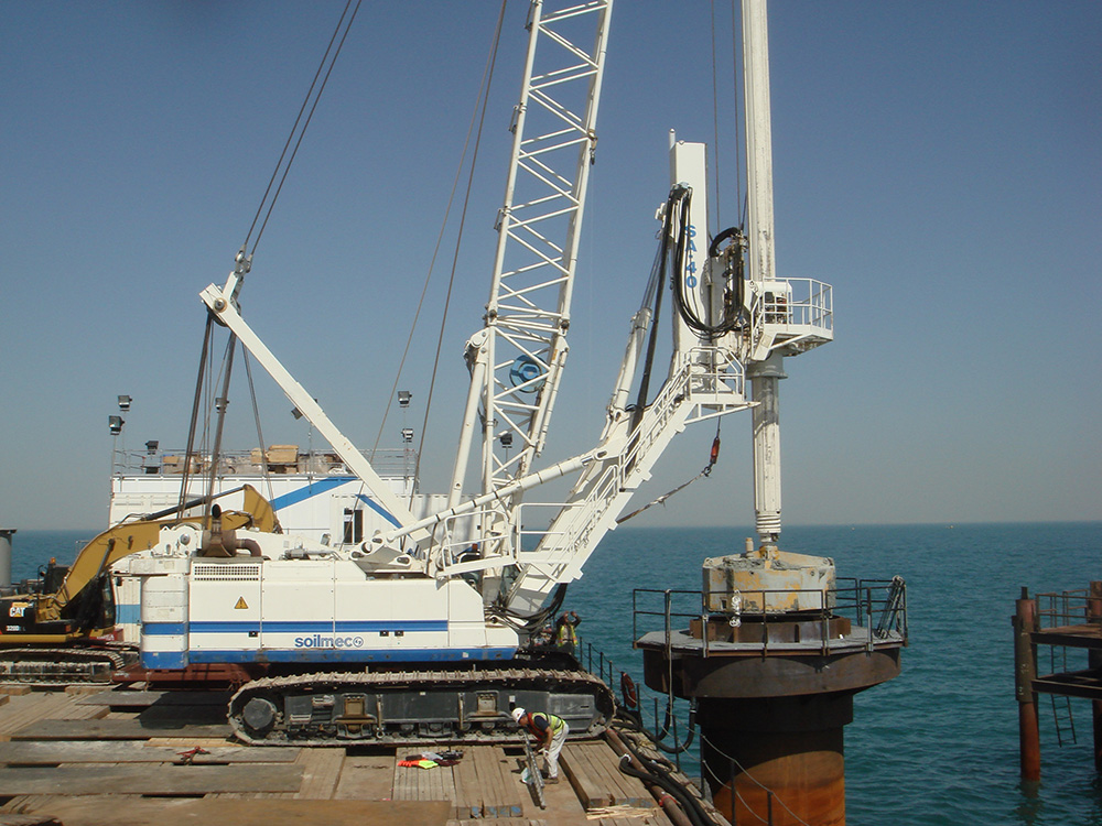 Trevi Foundations Kuwait is constructing the onshore piles with a Soilmec SR-100 and R-930 (equivalent to the newer SR-90) drilling rigs. They are installing the offshore piles with a Soilmec SC-120HD crane fitted with a Soilmec SA-40 hydraulic rotary head attachment, which allows the operator to change the working radius to reach over 6 m (20 ft) from the barge to the center of each pile.