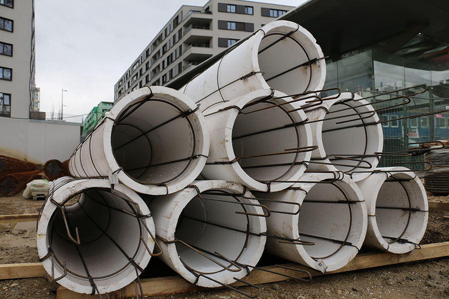 An underground train line crosses below the entire length of the jobsite, complicating project. In fact, the project will likely need specialized reinforcement cages for all the piles adjacent to existing train line structure, in order to limit the vibrations and prevent any possible collapse. These cages consist of two sections – a standard cylindrical bottom section, and a top section with a smaller diameter completed with an external polystyrene cover. In addition this section is finally wrapped with a stretch film.