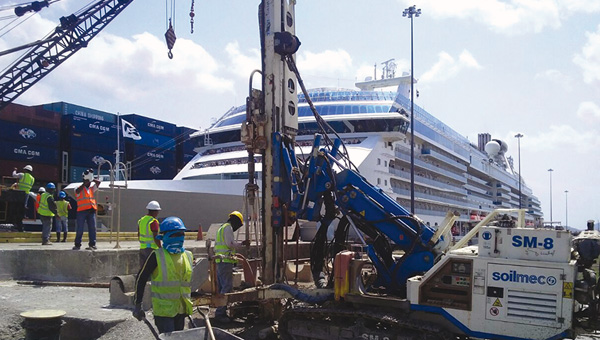 Trevi Panama analyzed approximately 6000 linear meters of soil (2500 m Atlantic side and 3500 m Pacific side) to determine its geological and geotechnical features. They also constructed deep piles for locks, docks, and bridges, including drilling 14000 linear meters of ground with the large diameter bored pile method, mostly cased. For these foundation works, they depended on Soilmec medium-large hydraulic drill rigs: SR-60, SR-70, R-825 and R-930.