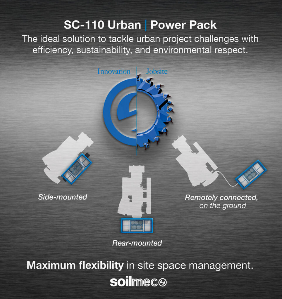 The SC-110U is specifically designed for hydromill applications. In combination with the SH-35, it guarantees high performance and flexibility. The setup allows operation in construction sites with extremely confined conditions. Two height configurations are available (standard and low headroom), and each configuration can be arranged with the power pack in three different positions.