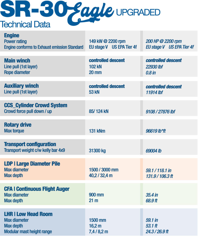 The SR-30 Eagle is the smallest model in Soilmec’s line-up of drilling rigs. Built with a lightweight design the rig features a high torque rotary head, powerful Diesel engine and the new segmental mast. The SR-30 Eagle is a modern machine equipped with several accessories, devices and the DMS 4.0 system to ensure the highest level of connectivity, accessibility, and safety.