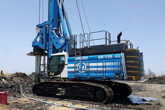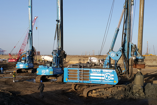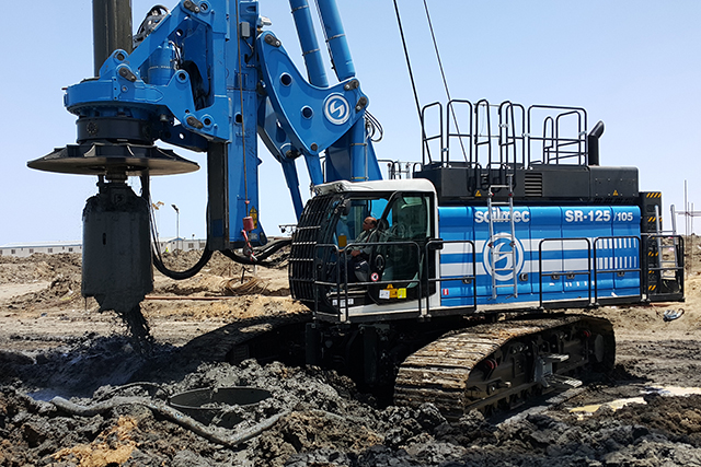The piles are designed with a diameter of 1200 mm and a maximum depth of 74 m. The excavation is performed by using bentonite mud and an 8-12 m long temporary casing installed by the same rig. Within the project of Port Said harbors expansion, many Soilmec rigs have been chosen for their flexibility and fast operating capacity: SR-60, SR-70, SR-95, SR-105 and especially the new SR-125 HIT are operating successfully throughout the area.